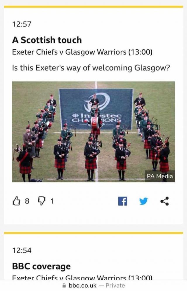 ![]() ![]() ![]() ![]() ![]() ![]() | ![]() RUGBY We were invited to join the City of Exeter Pipes & Drums to play for the pre-match entertainment at Sandy Park for the Exeter Chiefs vs Glasgow Warriors European Cup rugby match on 13th January. This picture was from the BBC online commentary on the day. As well as playing on the pitch, we got the chance to watch the game and after a close encounter, the Chiefs just came out on top. We really enjoyed the experience, but it was very cold! BAND PERFORMANCES The band is looking forward to lots of interesting engagements 2024. ---------------- JOIN THE BAND! The band are always looking for new members, you can join at anytime just come along to a band practice on a Wednesday or Friday at St Mary's School, Bideford and join in and be part of a fun and friendly group. Find out more information HERE ![]() |